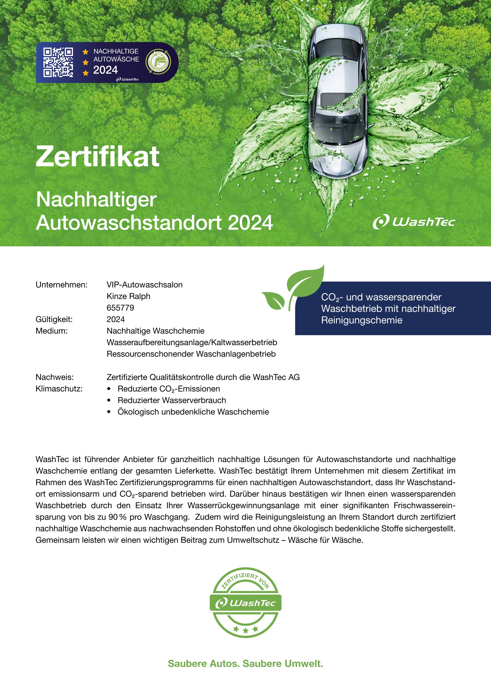 Wir freuen uns über die Zertifizierung zum Nachhaltigen Autowaschstandort 2023Mehr Info unter: www.nachhaltige-autowaesche.de
